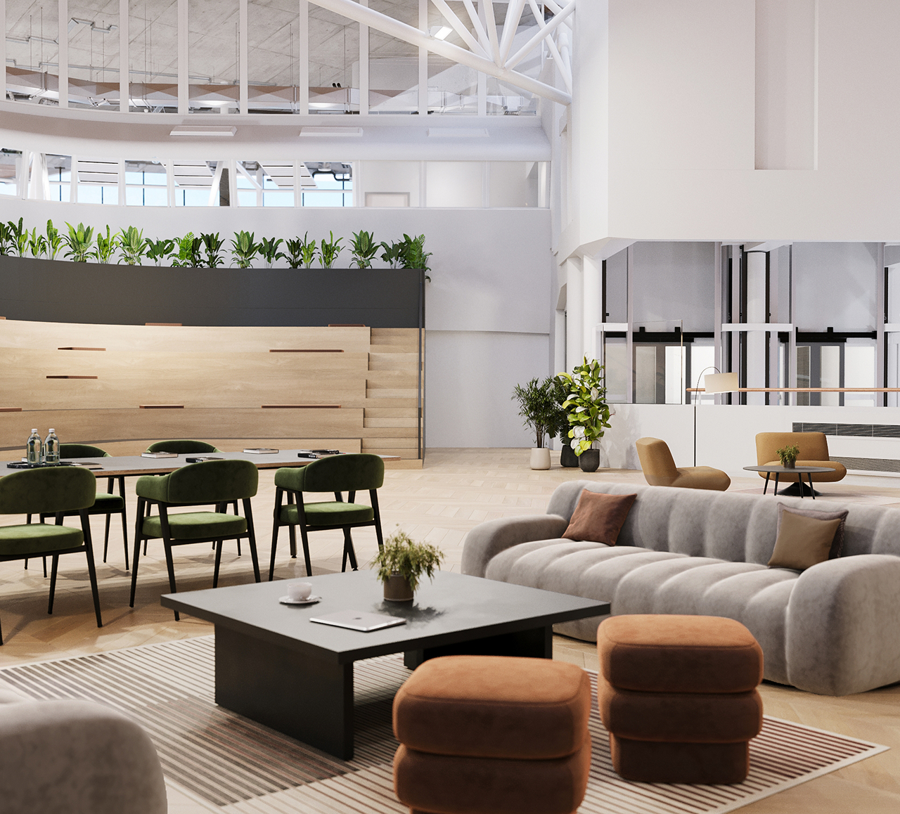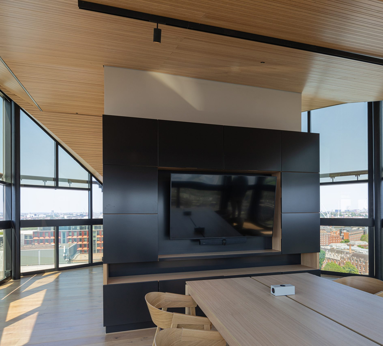 This 394 sq ft communal meeting room on the 12th floor can accommodate 8 people for a meeting. It is served by a private lift and is the perfect place to wow any client, with 360 panoramic views over the City and Hammersmith and is equipped with communal conference facilities.